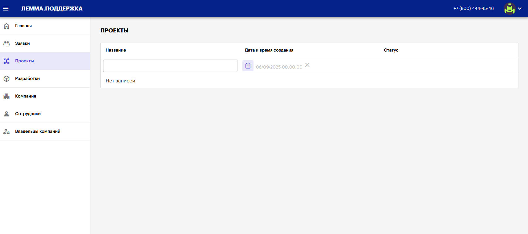 В таблице находится список всех проектов в рамках компании, к которой привязана учетная запись пользователя.