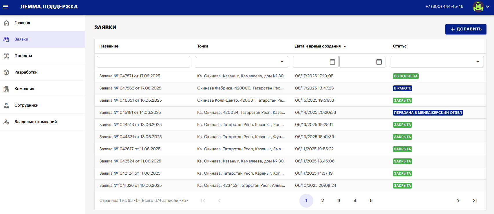 На странице располагается таблица с возможностью сортировки, фильтрации и пагинации. В таблице находится список всех заявок на обслуживание в рамках компании, к которой привязана учетная запись пользователя.