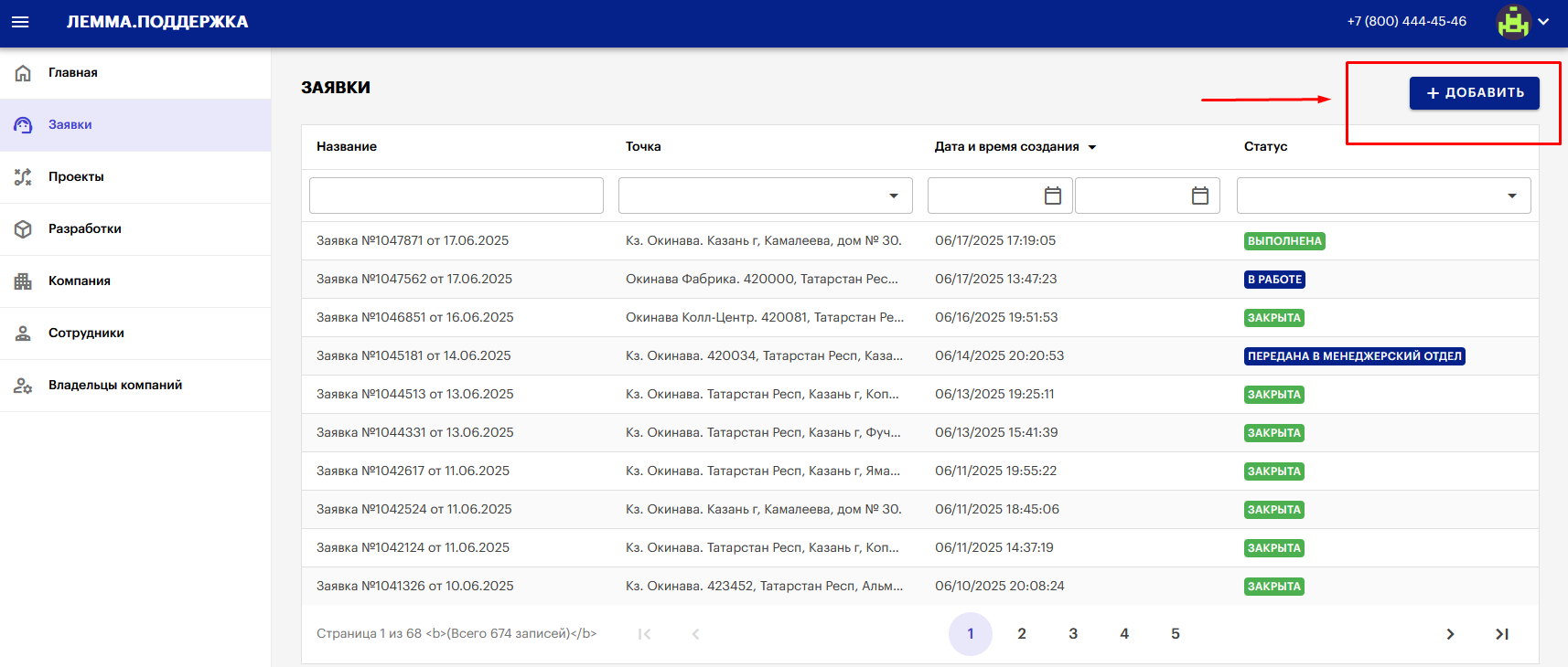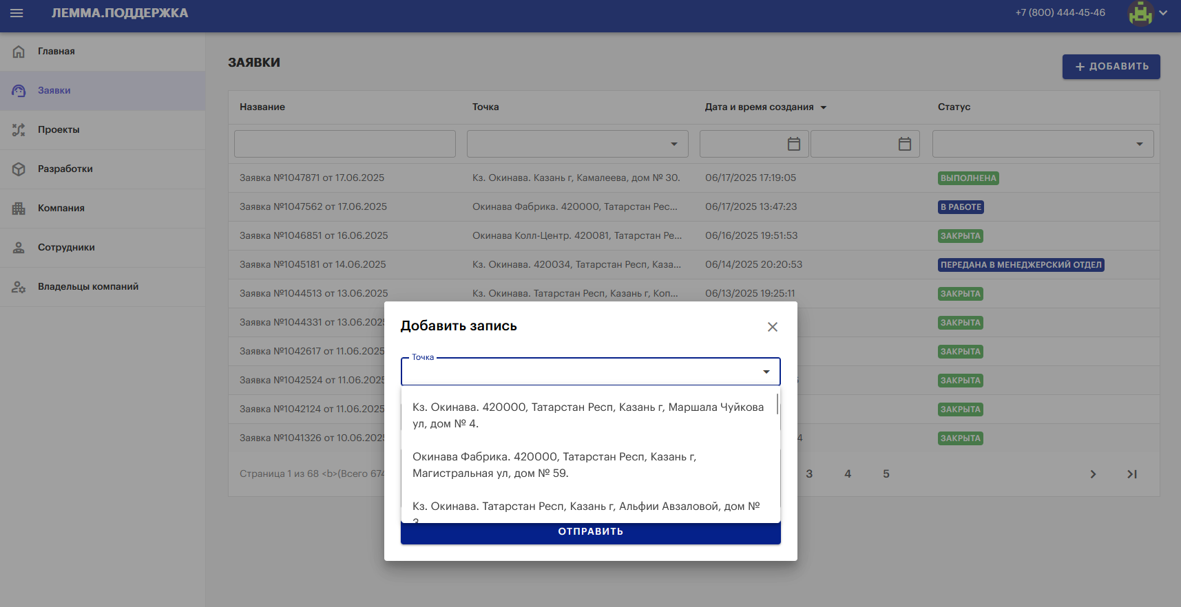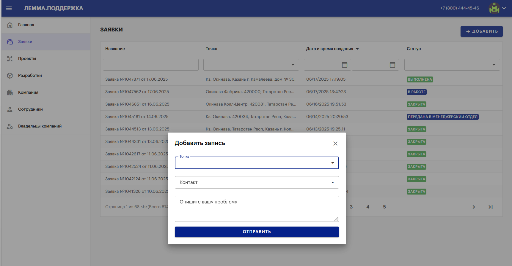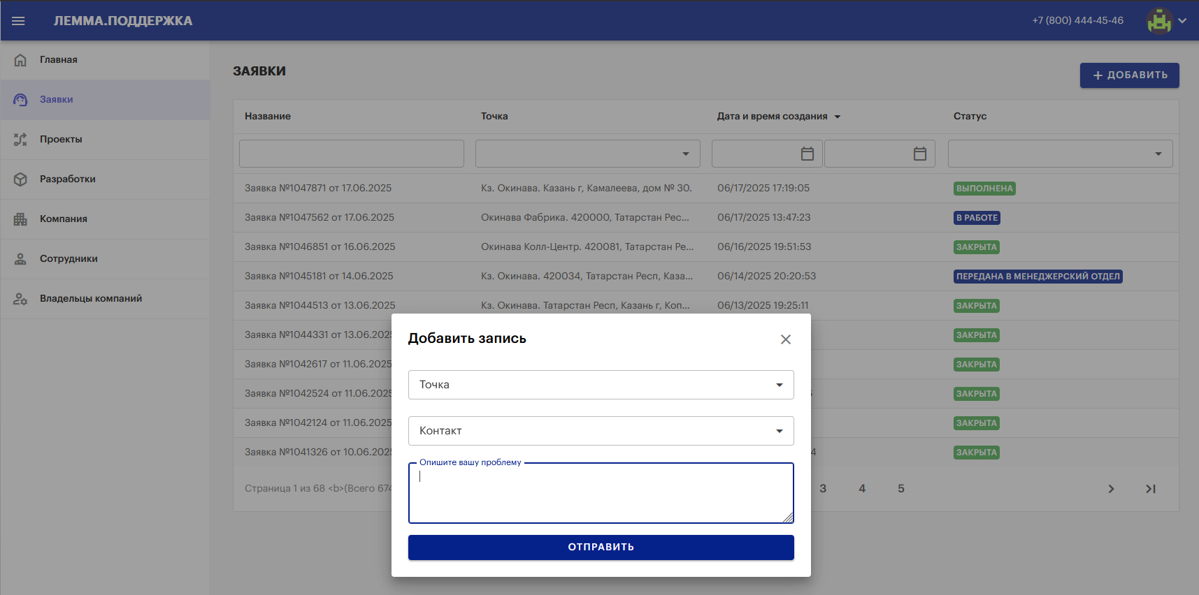 Пользователь может создать новую заявку, нажав на кнопку с иконкой плюса в правой части экрана над таблицей. При нажатии появляется модальное диалоговое окна с формой создания заявки.