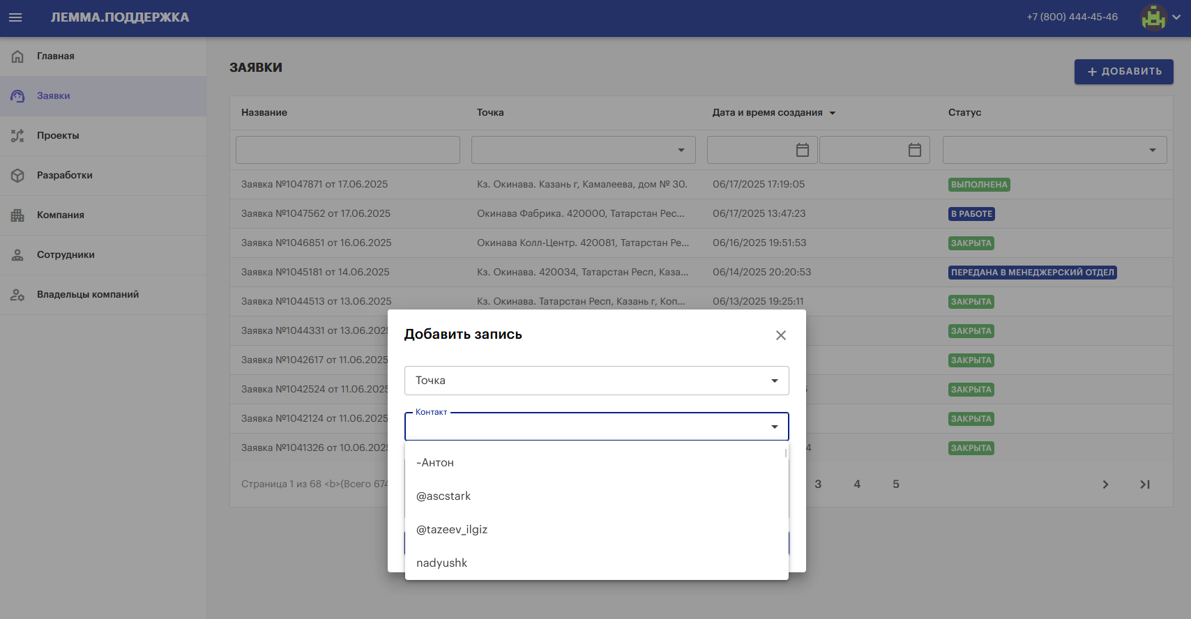 - Контакт – контактное лицо, с которым можно связаться в рамках решения заявки. Поле представлено в виде выпадающего списка с перечнем всех активных контактов компании, зарегистрированных в системе автоматизации сервисного и технического обслуживания компании «Лемма». Пользователю необходимо выбрать один из доступных контактов;